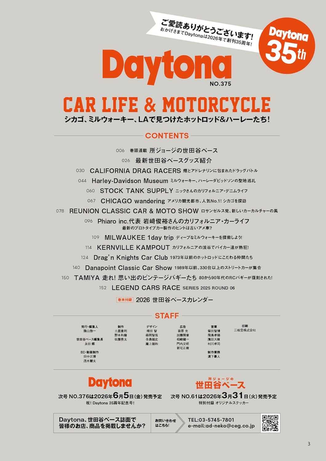 Daytona NO.375号では丸ごと一冊「ハーレー&ホットロッド」をテーマに編集。カリフォルニア、シカゴ、ミルウォーキーの現地の取材を中心に、ハーレー・ダビッドソンや古いアメリカ車を中心に、カッコいい乗り方を10テーマの大型特集でご紹介しています。
